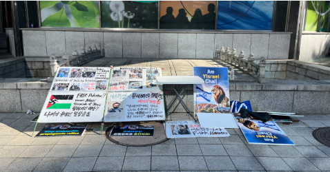 집회가 시작한 시각보다 조금 늦게 보신각에 도착한 Sol은, 아쉽게도 이스라엘 지지자들이 모여 구호를 외치는 모습은 놓치고 말았는데요. 다행히 그들이 행진하러 가느라 바닥에 남기고 떠난 피켓들은 발견할 수 있었습니다. |