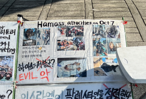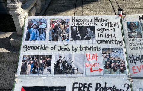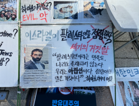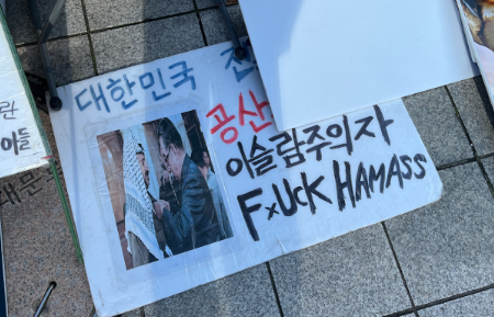 바닥에 놓여있던 피켓에는 ‘대한민국’, ‘공산(주의자)’, ‘이슬람주의자’, ‘Fxuck Hamass’ 등의 문구가 적혀있네요.