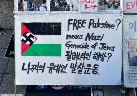 아래쪽 피켓으로 가봅시다. “Free Palestine? Means Nazi Genocide of Jews”, 팔레스타인 해방은 나치의 유대인 말살운동이라는 문구와 함께, 팔레스타인 국기에 나치 문양으로도 알려진 하켄크로이츠가 합성된 사진도 보입니다. |