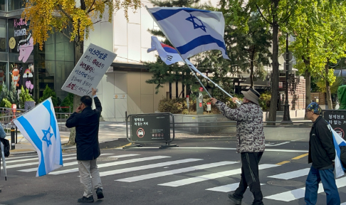 때마침 Sol은 얼마 떨어지지 않은 곳에서 이스라엘 국기를 힘차게 흔들며 행진하는 이들을 발견할 수 있었습니다. 이들은 SK서린빌딩 앞에서 격주로 열리는 팔레스타인 연대 집회를 마주 보고 있었는데요. 들려오는 주장은 아래와 같았습니다.