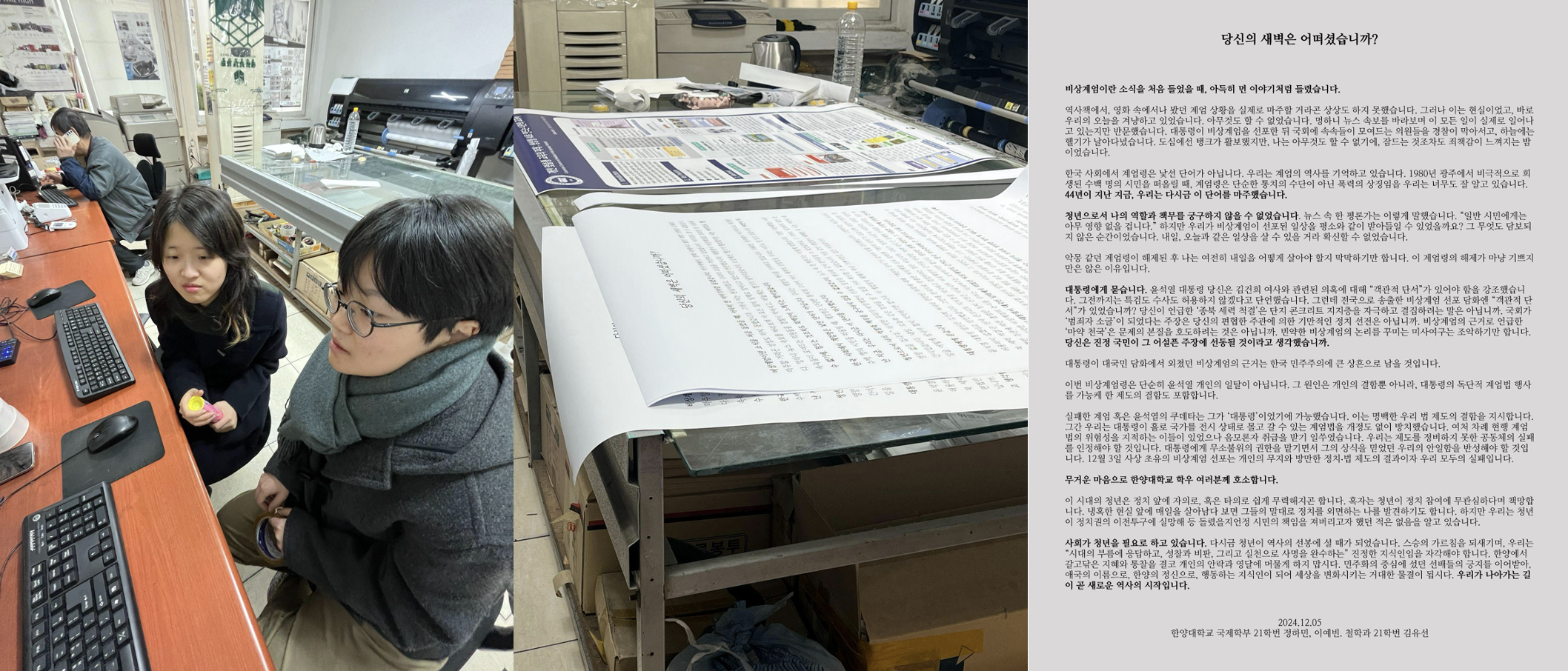 이미 몇 시간 못 잔 채로 등교한 터라 제정신이 아니었어요. 당일 오전에 수업을 어떻게 들었는지 기억도 나지 않습니다. 주변의 다른 이들은 어차피 해제된 계엄이라며 대수롭지 않게 여기는 것을 보고 ‘내가 이상한 건가’하는 생각에 다른 것에 집중하기 어려웠습니다.