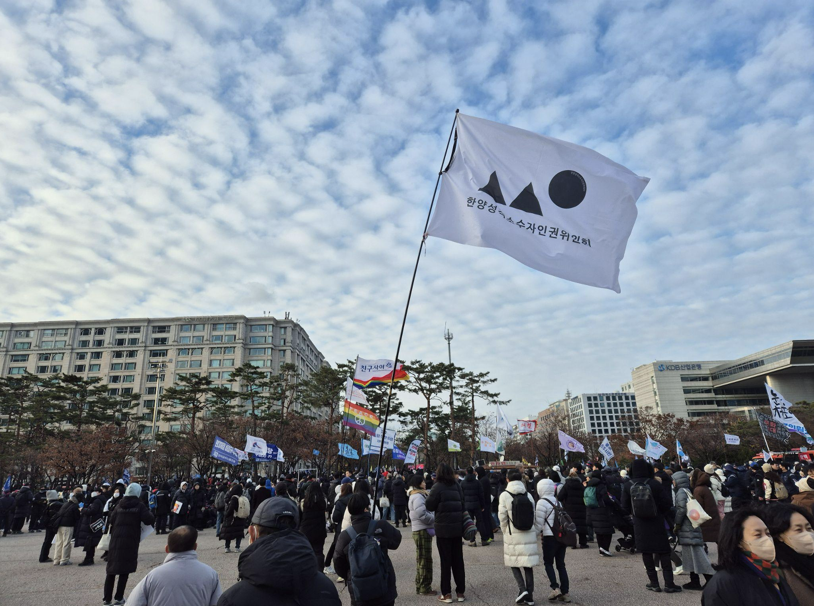 저는 이날 오후 내내 엄청나게 큰 저 사진 상의 깃대를 들고 있었는데요. 헤헤… 너무 힘들었어요… 진짜 이때 어떻게 버텼지?... 여러분, 깃발 맞추실 일 있으면 무조건 작은 사이즈로 하십쇼. 크다고 다 좋은 게 아냐… 이날은 탄핵 정국의 첫 주말이었는데, 탄핵 표결까지 아주 다사다난했지요. 현실의 괴로움이 너무 큰 탓에 프롬과 함께 익숙한 비트에 맞추어 신나게 흔들어 제낀 게 기억에 남습니다. 현실은 시궁창일지라도 오늘은 축제처럼 즐기자! 뭐 그런 식으로요.