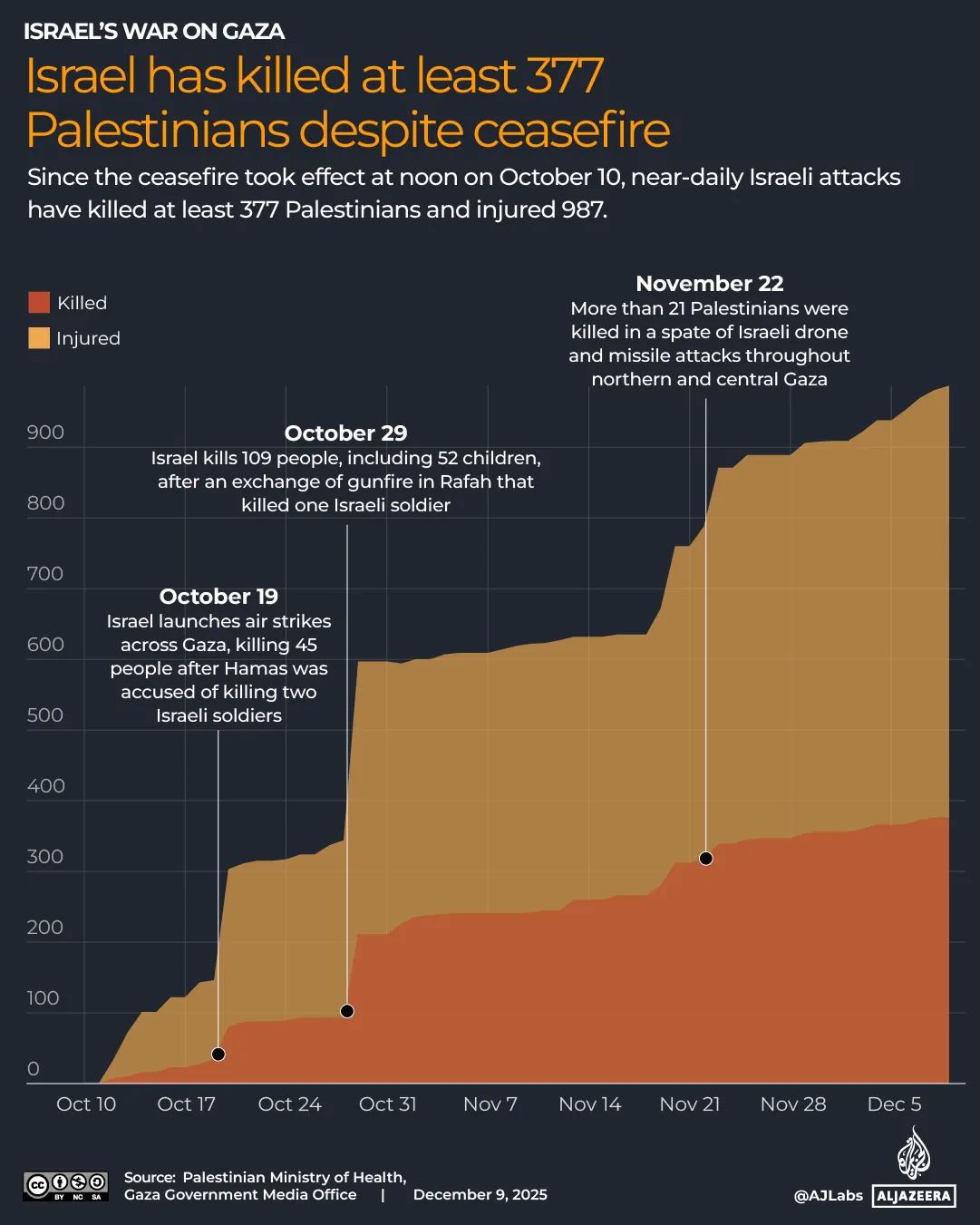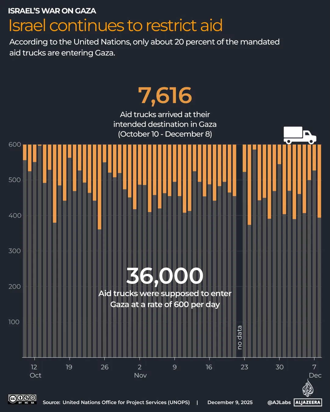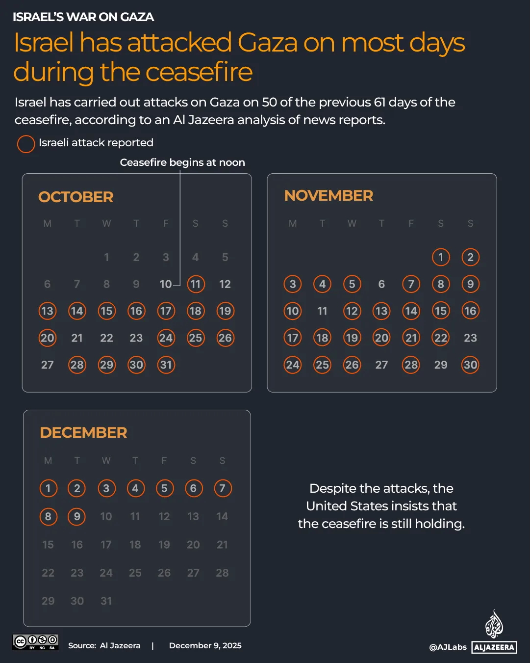이스라엘은 휴전 협정이 공식 발효된 2025년 10월 10일부터 12월 초까지, 가자지구를 55일 간 총 44일이나 공격했습니다. 포격이나 총격이 없던 날이 일주일을 고작 조금 넘긴 정도라면, 가자의 상태를 과연 ‘휴전’ 중이라고 할 수 있을까요? 오히려 이스라엘은 가자 주민들을 협상 이전과 동일한 방법으로 몰아세우는 동시에, 국제 사회의 관심으로부터 더욱 소외되도록 유도하고 있습니다. |